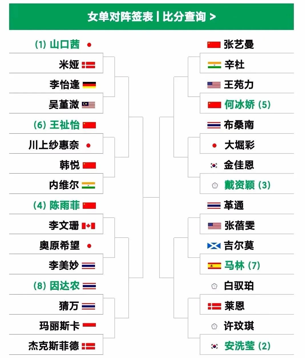 女单方面也不容乐观。5号种子何冰娇,和队友张艺曼分在同一小组。且张艺曼首轮便要面对印度的辛杜。6号种子王祉怡和韩悦也同处一个小组。只有陈雨菲作为4号种子没有提前遇上国羽队友。